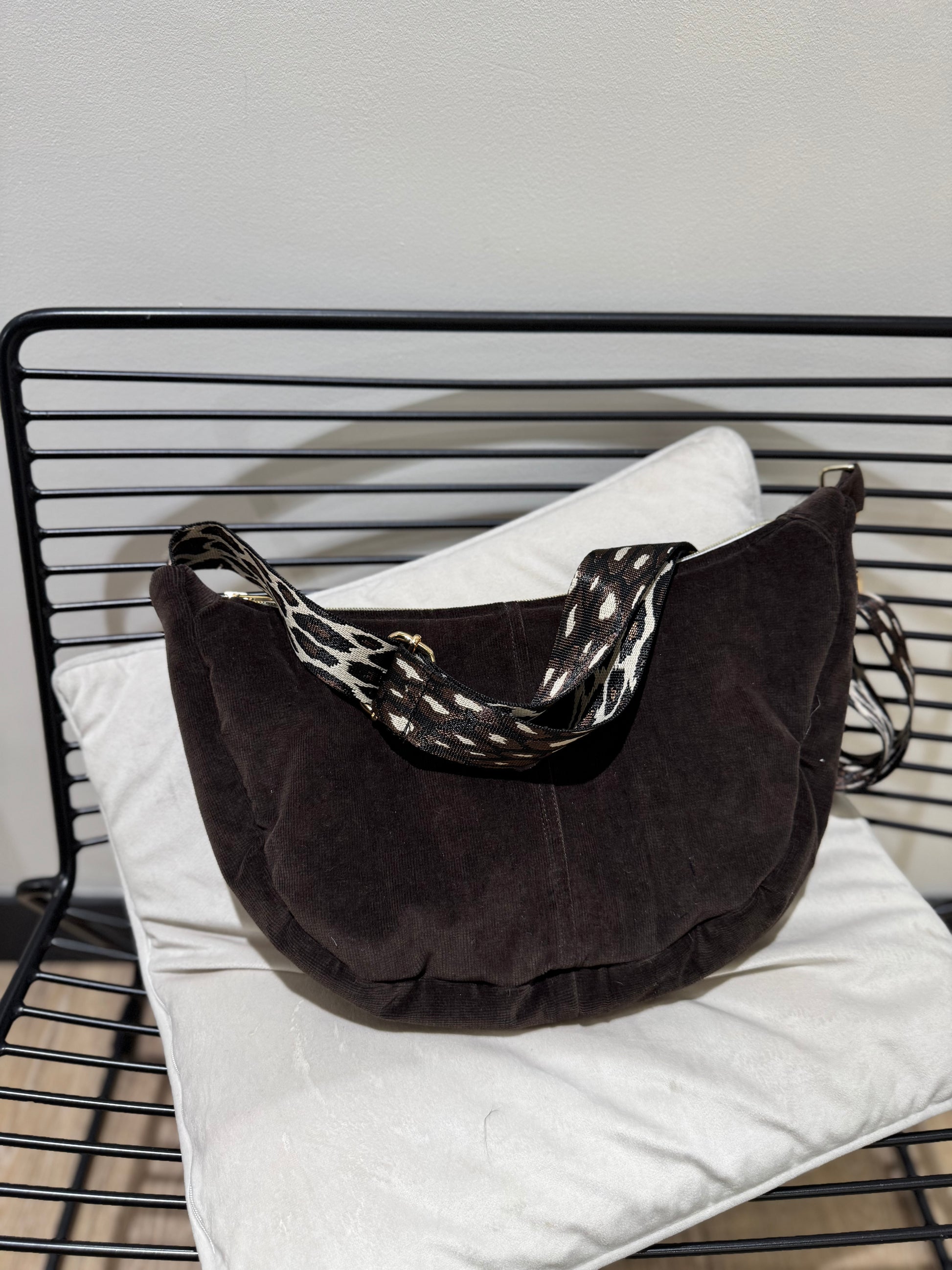 Découvrez le sac demo-lune upcyclé marron velours, une pièce unique faite main à partir de vêtements vintage. Sa texture douce et son anse léopard audacieuse ajoutent une touche d'originalité à votre style. Embrassez l'élégance durable tout en vous démarquant avec passion et créativité !
