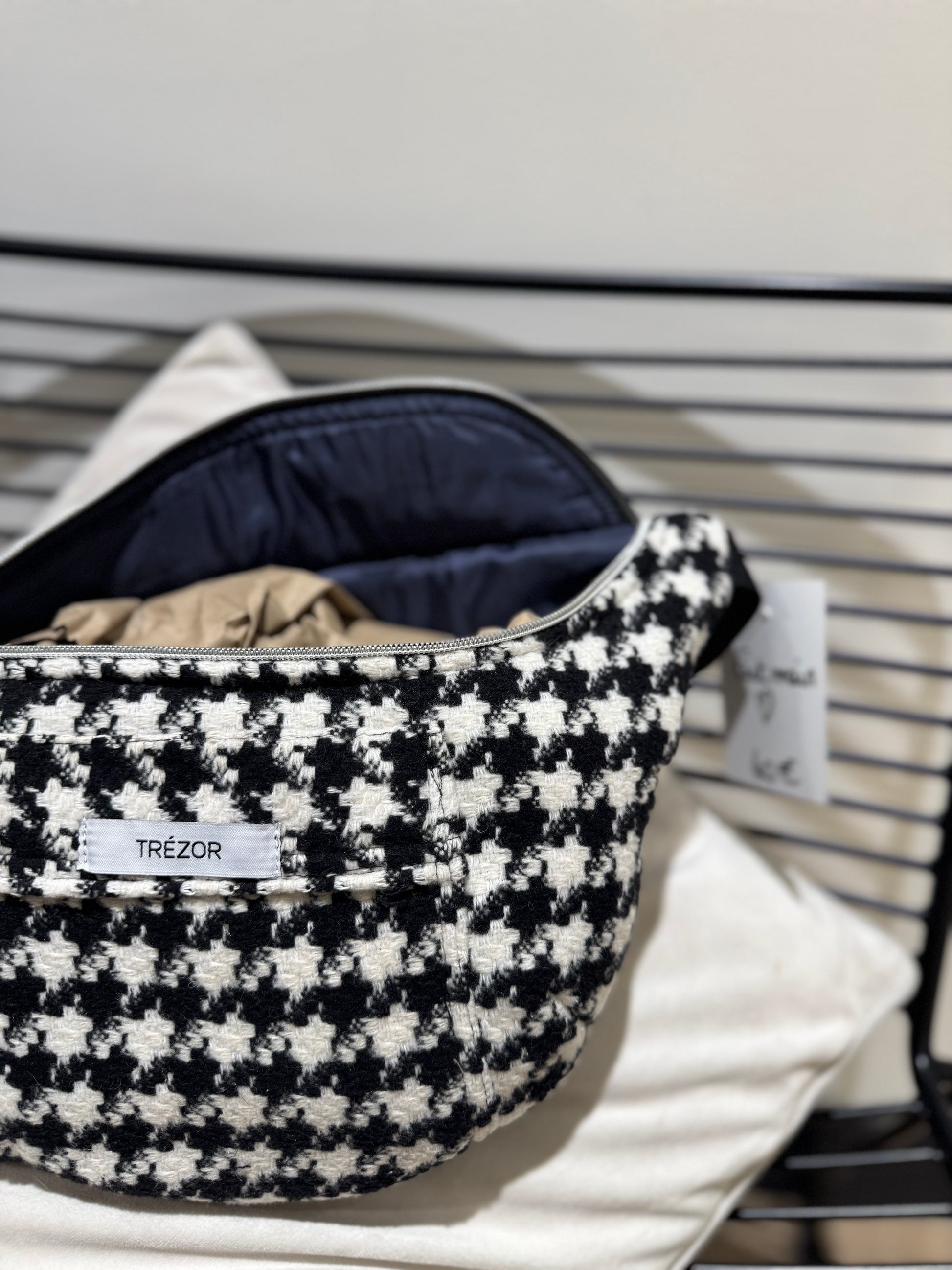 Ce sac banane pied de poule est fait main à partir de tissu upcyclé noir et blanc. Conçu pour être pratique et tendance à la fois, il convient à tous les styles et peut contenir tous vos essentiels. Fabriqué avec soin, il est à la fois durable et écologique.